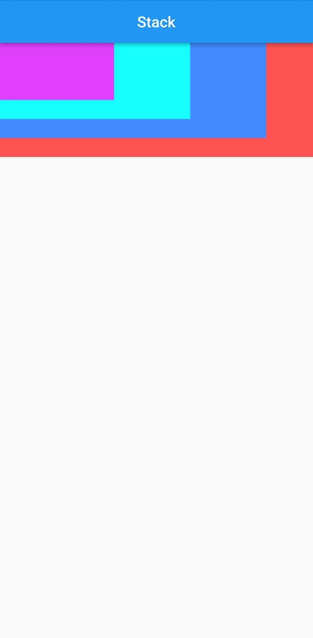 Stack은 단지 정해진 위치나 규칙 없이 위젯들을 배치만 하므로 Container들이 겹치는 것을 확인하실 수 있습니다.