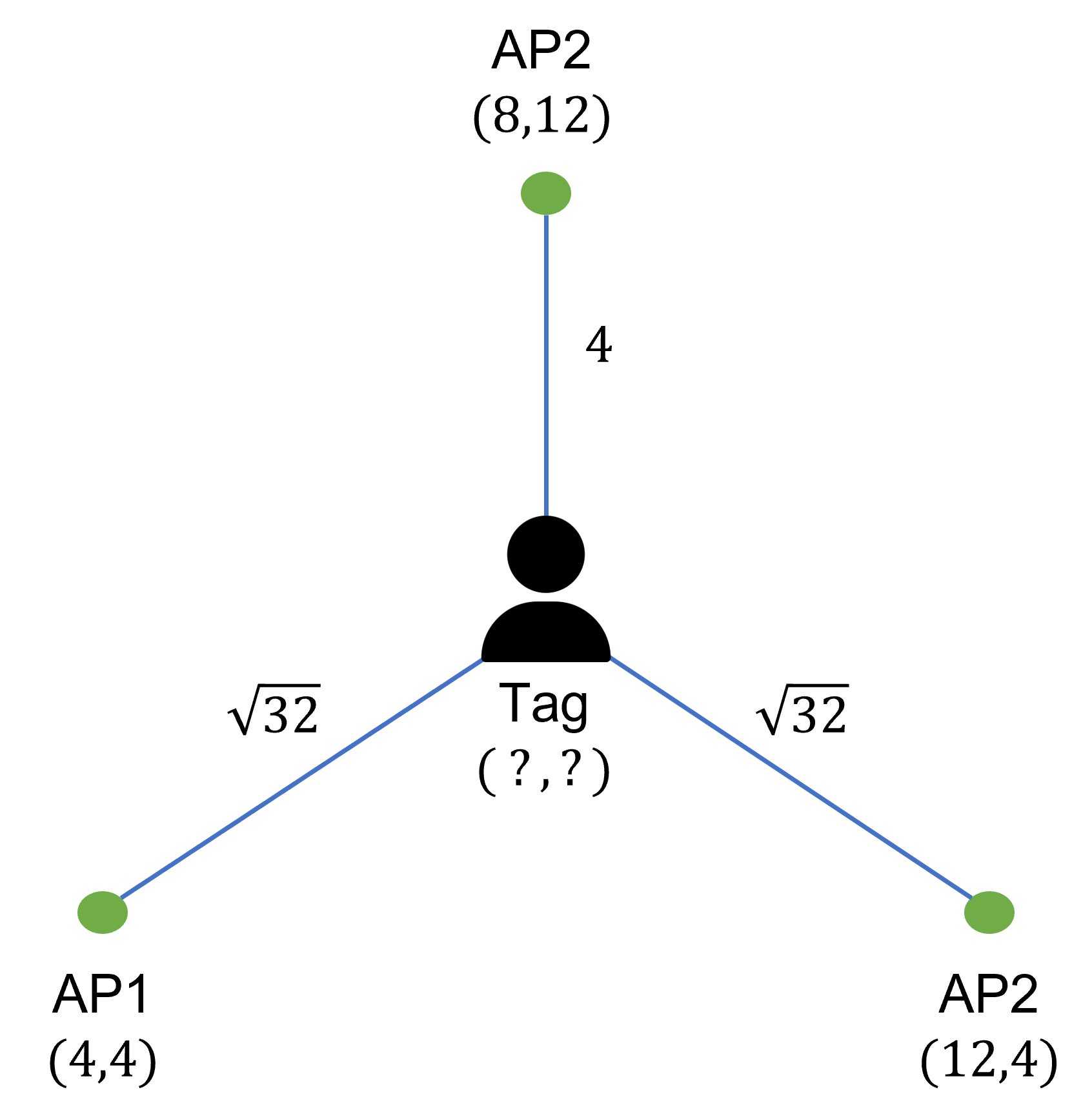 아래 그림과 같은 상황에서 사용자 (Tag)의 위치를 구한다고 가정해봅시다.