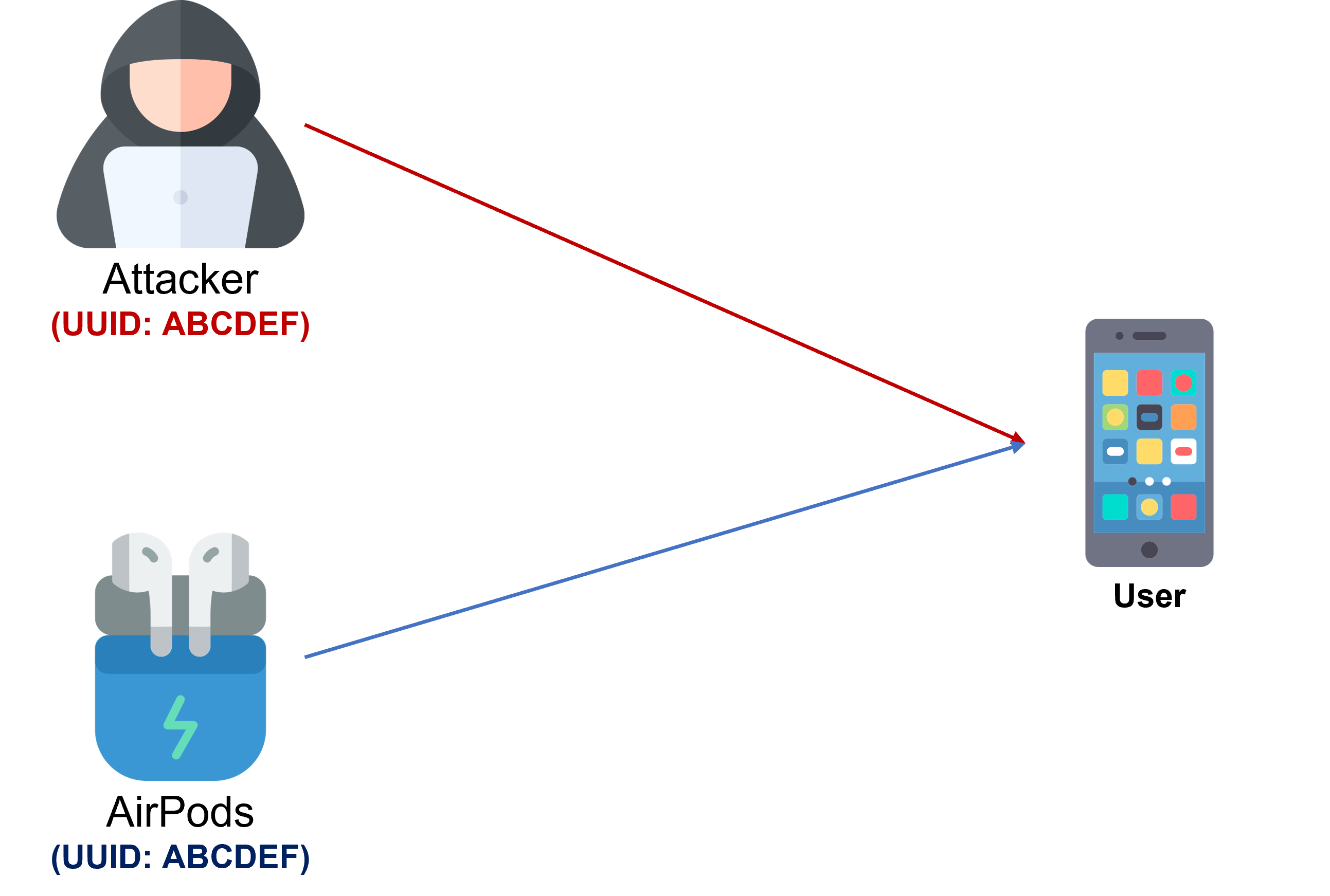 우리가 흔히 사용하는 BLE 기기인 에어팟을 예시로 들어보겠습니다. 유저는 에어팟의 식별자로 사용될 수 있는 UUID (Universally Unique Identifier)나 Mac Address를 통해 주변의 수많은 BLE 기기 중 본인의 에어팟을 찾아 연결할 수 있습니다. 공격자 또한 우리 에어팟의 식별자를 알고있다면 사용자에게 연결을 요청할 수 있습니다.