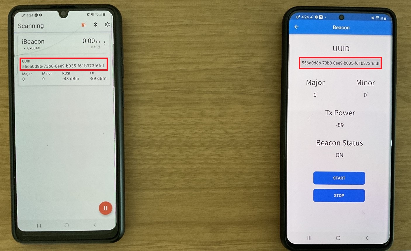 오른쪽 스마트폰은 주기적으로 광고 패킷을 방송합니다. 그리고 왼쪽 스마트폰은 비콘 스캐너 앱을 사용하여 광고 패킷의 정보를 확인합니다. 같은 방법으로 우리가 사용하고 있는 BLE 기기들의 광고 패킷 정보도 쉽게 찾아볼 수 있습니다.